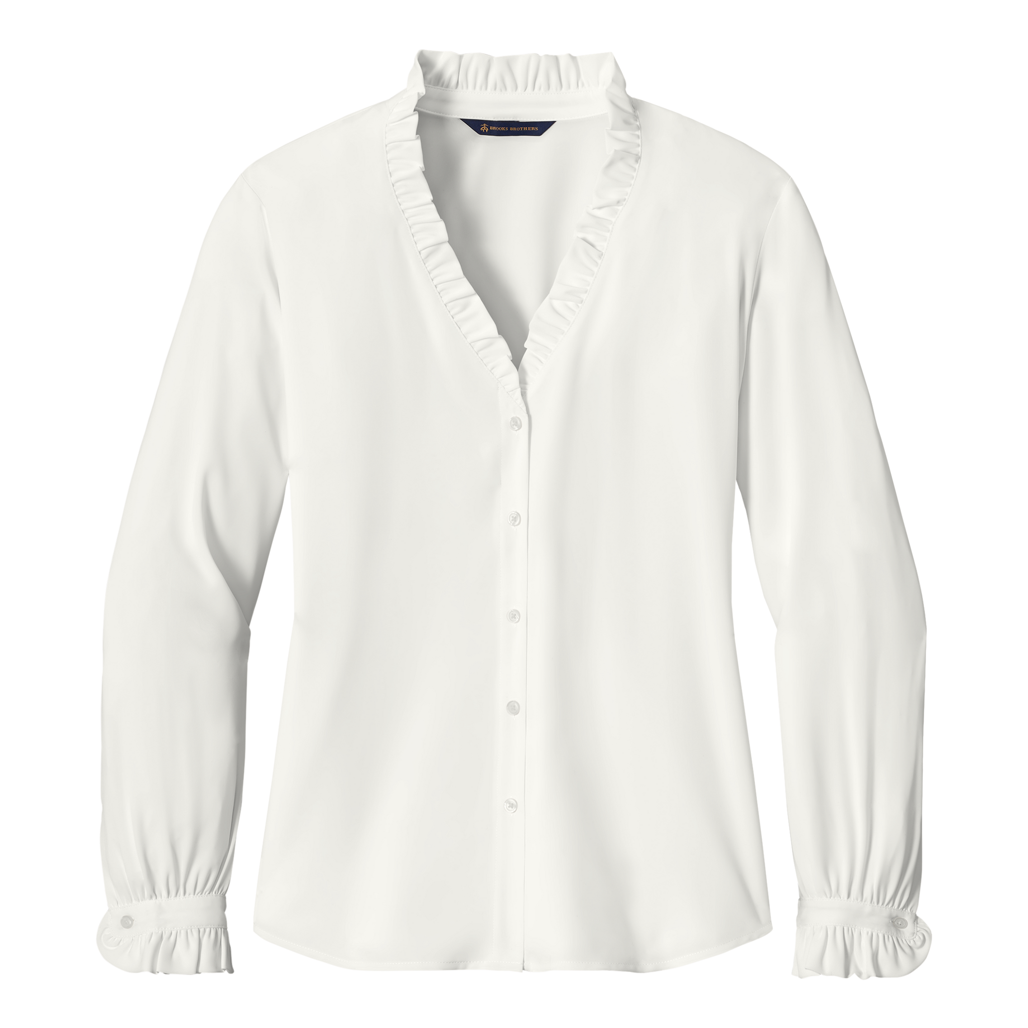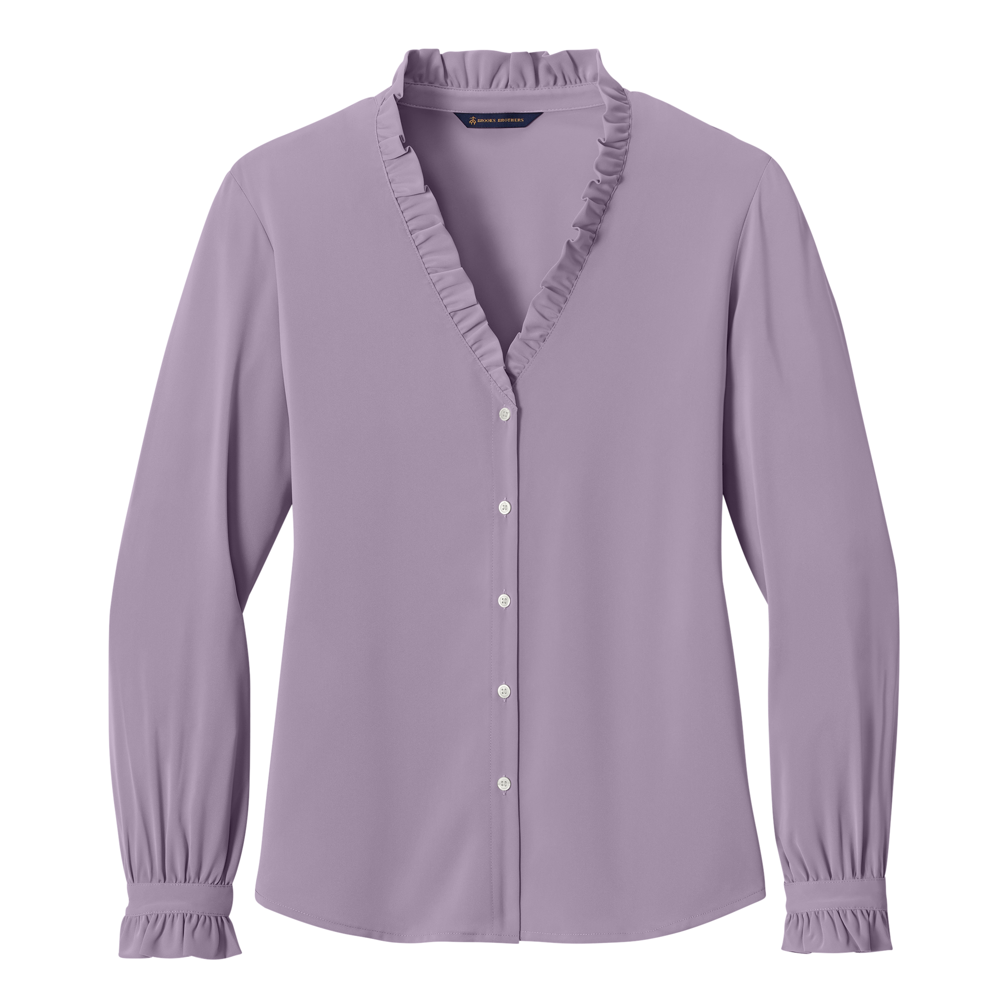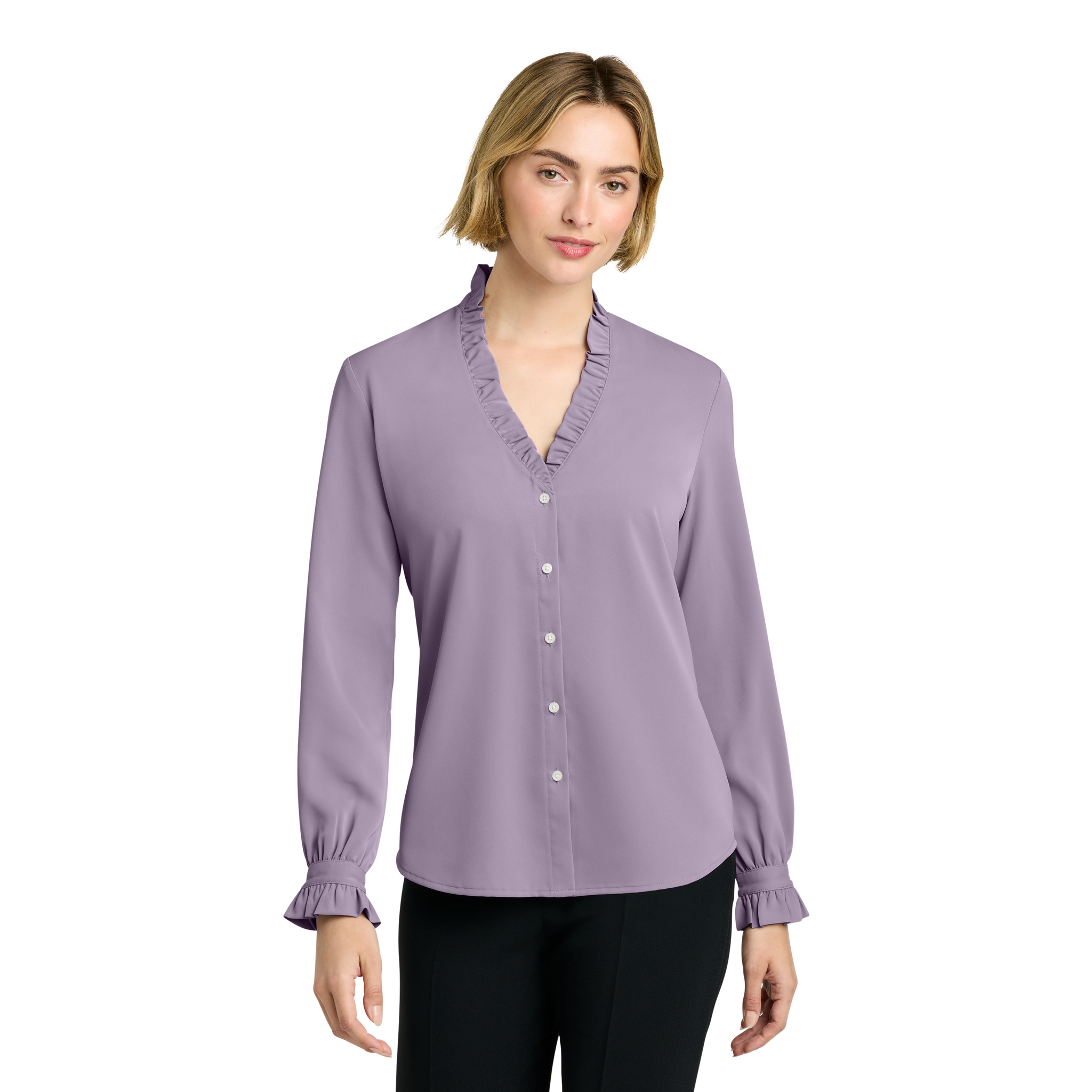 Complete with ruffle accents, this classic, feminine blouse is crafted in beautiful satin.