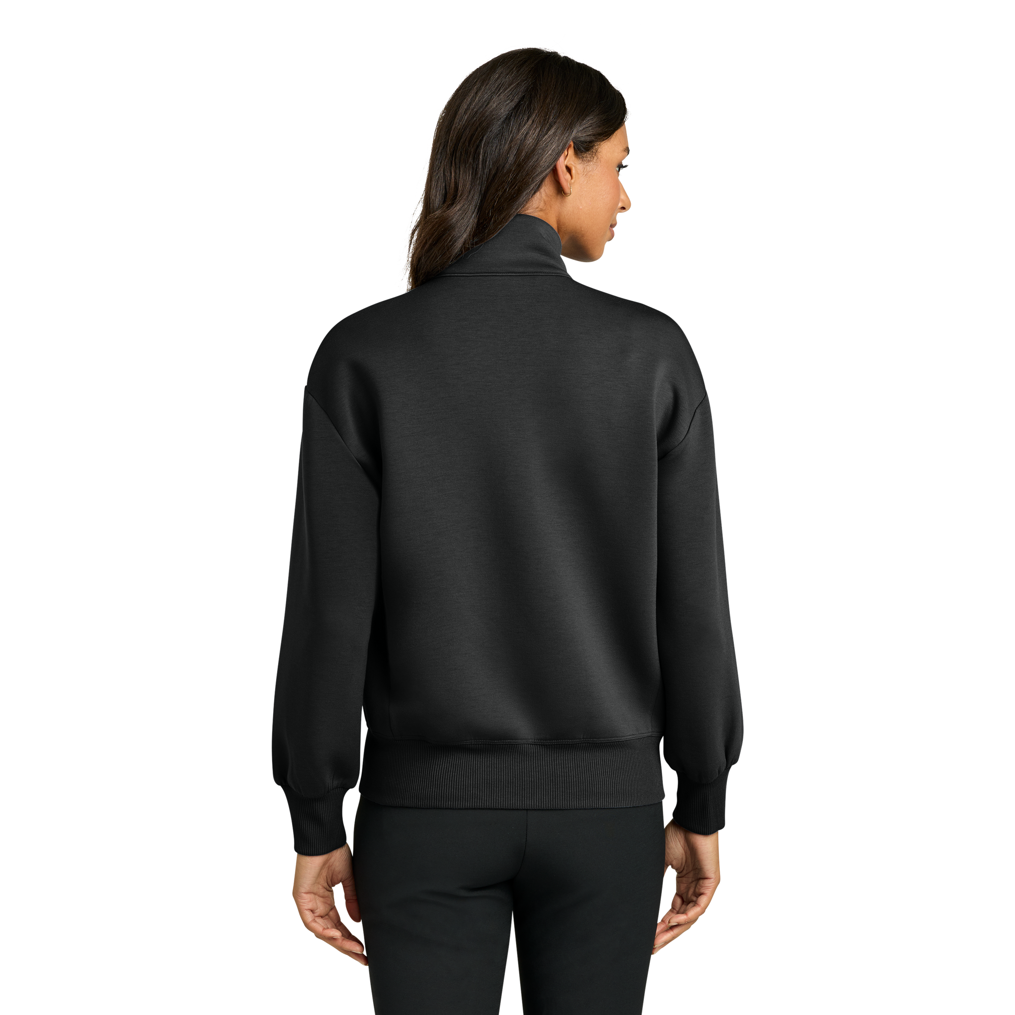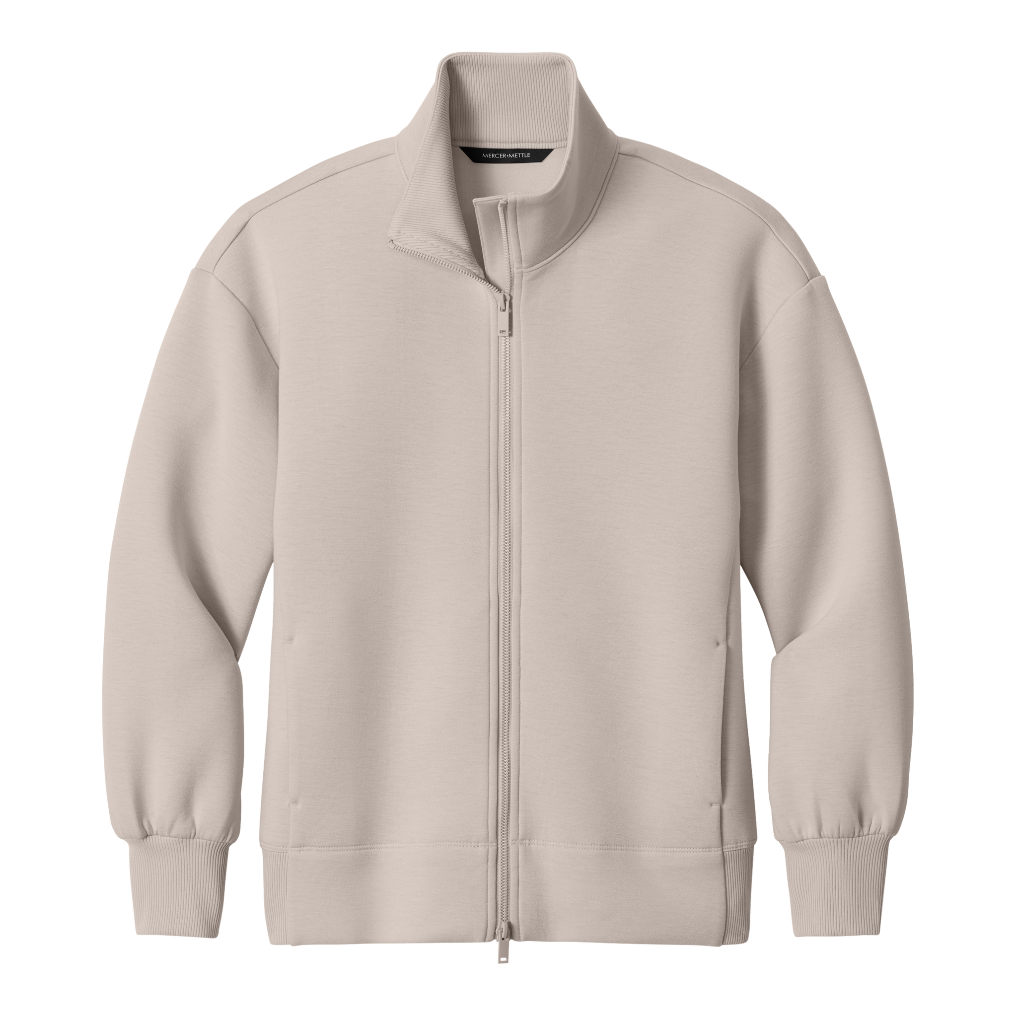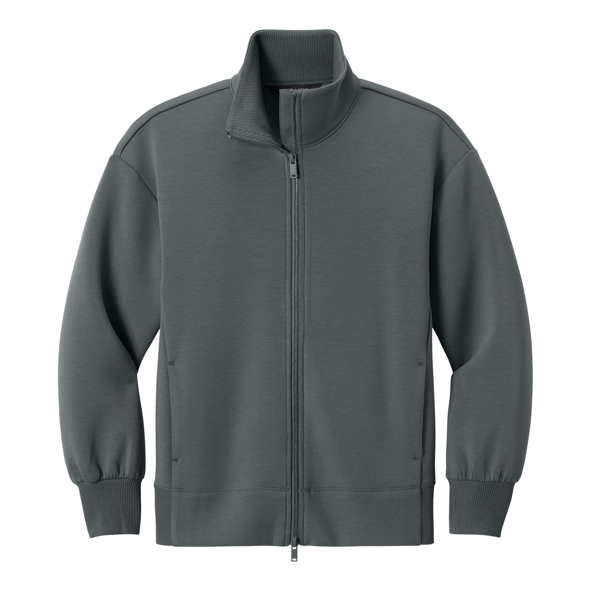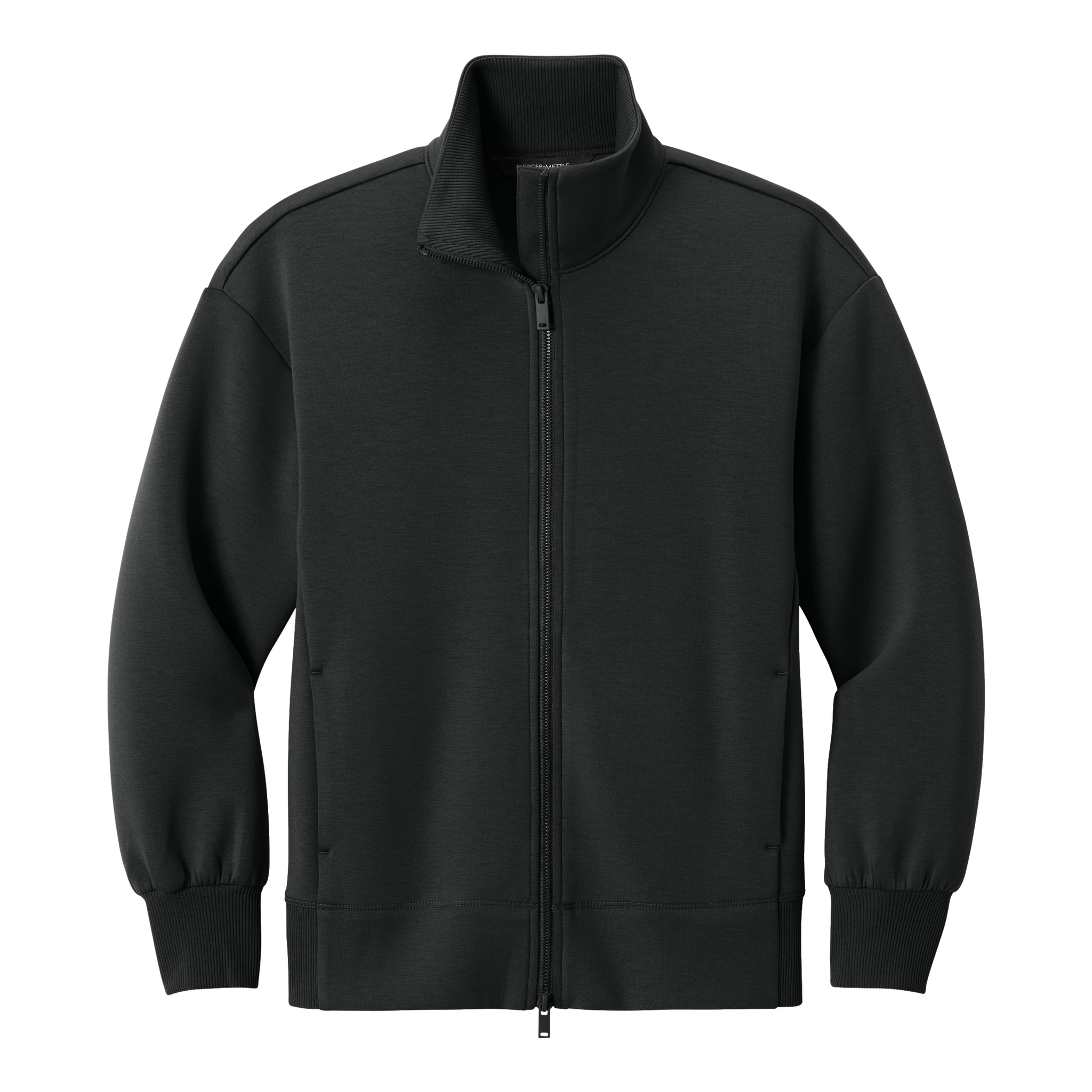 - 2x1 rib knit cuffs and hem